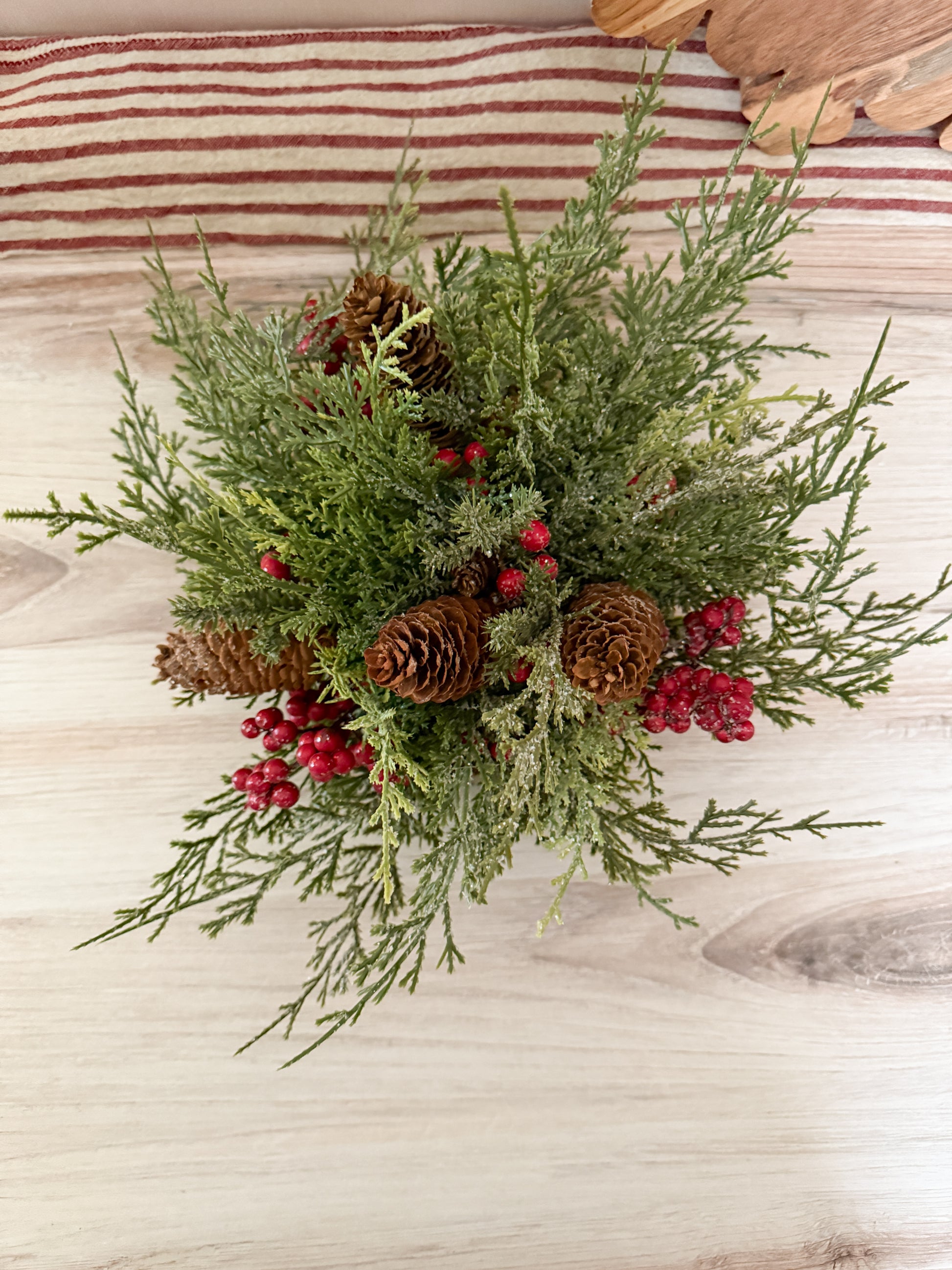 This 11" half sphere of frosted cedar greenery will fit perfectly with your snowy winter display and your holiday décor.